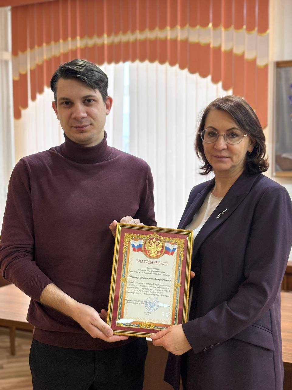 Почётной грамотой Октябрьского районного суда: Черникова Виктория Андреевна – помощник судьи Октябрьского районного суда г. Липецка; Наумова Елена Николаевна – главный специалист отдела по обеспечению гражданского судопроизводства Октябрьского районного суда г. Липецка. Благодарность председателя Октябрьского районного суда г. Липецка объявлена: Долговой Светлане Александровне – заместителю председателя Октябрьского районного суда г. Липецка; Лузгиновой Ольге Викторовне – судье Октябрьского районного суда г. Липецка; Лагуте Константину Павловичу – судье Октябрьского районного суда г. Липецка; Родионову Константину Александровичу – помощнику председателя Октябрьского районного суда г. Липецка; Сысоевой Юлии Игоревне – помощнику судьи Октябрьского районного суда г. Липецка.